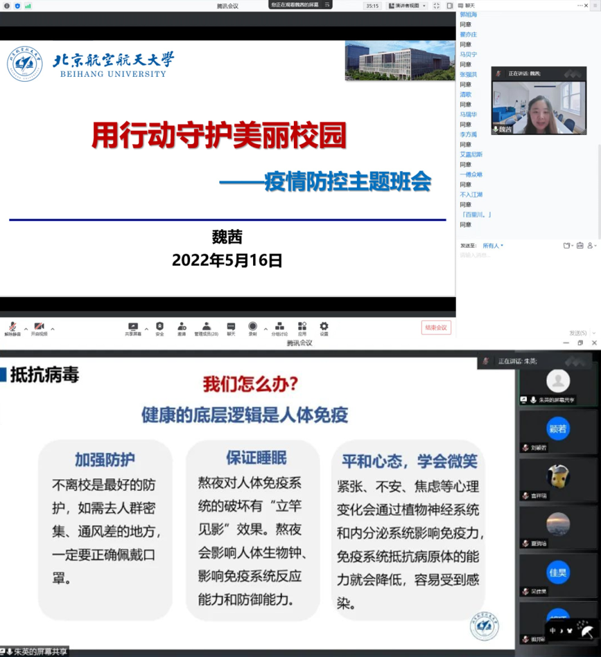 米兰milan官方网站班主任、辅导员以“共克时艰,守护美丽校园”为主题面向学院全体学生召开班会,发出拒绝外卖、减少快递、守护美丽校园的倡议,将学校的暖心举措详细告知同学们。同学们纷纷表示,大爱暖心北航,要用行动守护美丽校园。