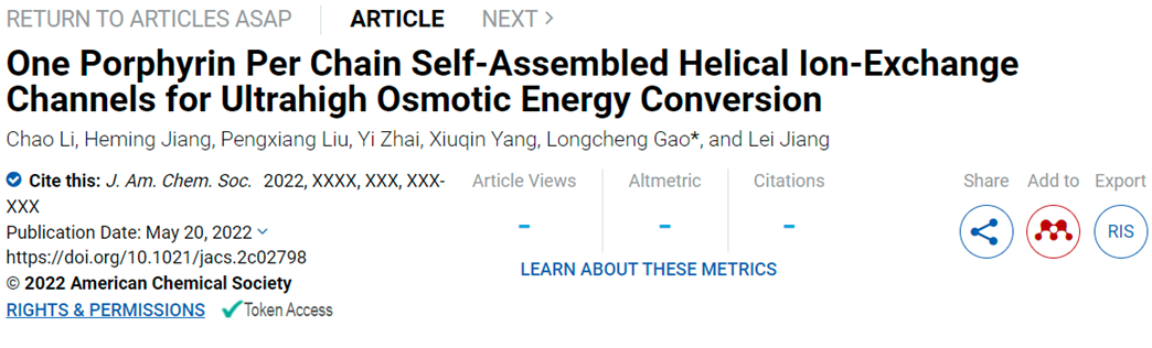 2022年5月20日,Journal of the American Chemical Society 在线发表了米兰官网江雷院士、高龙成副教授团队在高效离子交换膜方面的最新研究成果:“One Porphyrin Per Chain Self-Assembled Helical Ion-Exchange Channels for Ultrahigh Osmotic Energy Conversion”。米兰milan官方网站博士生李超为第一作者,高龙成副教授为通讯作者,米兰milan官方网站米兰milan官方网站为第一单位。