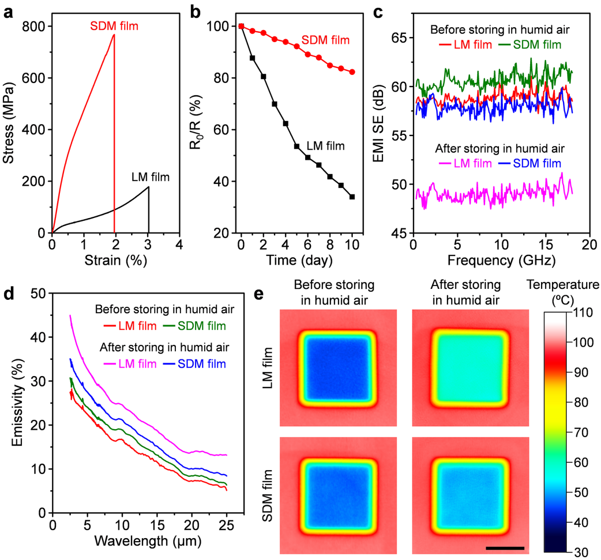 图4. LM和SDM薄膜的性能:(a)LM和SDM薄膜的拉伸应力-应变曲线;(b)LM和SDM薄膜在潮湿空气中储存10天过程中的电导保持率;LM和SDM薄膜在潮湿空气中储存10天前后的(c)电磁屏蔽系数,(d)红外发射率以及(e)在100度加热台上的红外照片
