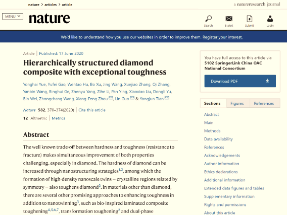 2020年6月18日,Nature杂志在线全文发表了米兰官网郭林教授、岳永海教授团队与燕山大学田永君院士团队在纳米孪晶复合金刚石增韧机制方面的最新研究成果:“Hierarchically structured diamond composite with exceptional toughness”。岳永海教授、高宇飞博士、胡文涛教授、徐波教授为文章共同第一作者,周向峰教授、郭林教授、田永君院士为共同通讯作者。