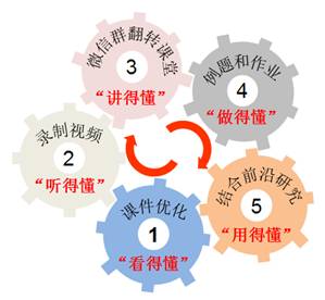 《物理化学A》是米兰milan官方网站化学和应用化学专业本科生的核心专业理论课,主要讲授化学过程的基本原理和基本规律,为实际的科研和生产过程提供理论指导。物理化学课程中的理论都是建立在大量抽象的概念、模型以及数学推导的基础之上,因此需要缜密地分析和反复地推敲才能理解这些概念的物理意义以及理论适用的体系和条件。另外,由于课程讲授的是最基本的理论,同学们在学习课程的过程中容易感觉课程内容过于经典,产生课程内容对化学前沿研究无用的错觉。针对课程的这些特点,为了确保线上教学具有良好的效果,课程负责人刘兆阅老师在线下授课的基础上,采取多维措施对线上教学进行设计,建立了适合《物理化学A1》线上教学的“5懂”授课模式(图1)。