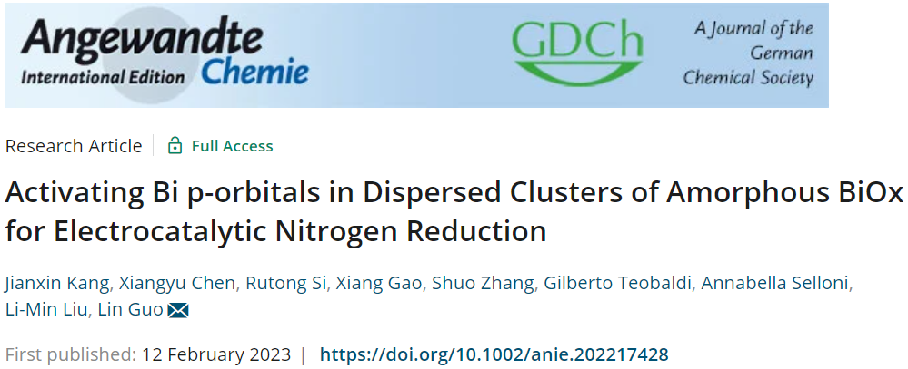 近日,米兰milan官方网站郭林教授和物理学院刘利民教授研究团队在高度分散的原子级非晶BiOx团簇可控制备及其电催化氮气还原反应方面取得新进展。相关工作以“Activating Bi p-orbitals in Dispersed Clusters of Amorphous BiOx for Electrocatalytic Nitrogen Reduction”为题,2023年2月12日在线发表在《Angewandte Chemie International Edition》杂志上。该研究获国家自然科学基金项目(No. 51532001, 11974037)等资助。米兰milan官方网站副教授康建新为文章的第一作者,米兰milan官方网站博士生陈翔宇和北京计算科学研究中心博士生司如同为共同一作,米兰milan官方网站为该论文的第一完成单位。