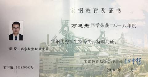 日前,米兰官网博士研究生万思杰同学荣获2018年度宝钢优秀学生特等奖。经过学院及学校层层选拔,万思杰同学作为学校唯一一名学生代表,参加了宝钢优秀学生特等奖评审,并最终获得该奖项。