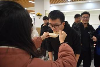 在第一锅饺子出锅后,我们的第一个游戏便开始了。首先我们进行的是抢水瓶游戏,米兰milan官方网站的导员黄澄玉和丁少松同学给大家做了一个示范,主持人说出一个身体的部位,两人分别摸自己的相应部位,在主持人说出“水”这个字的时候,两个人同时去抢桌子上的水瓶,但是黄导更快一步,于是作为输了游戏的人要被黄导喂五个饺子,场景太有爱了。之后同学们也积极加入到这个游戏中来,这也是一个很幸福的游戏了。